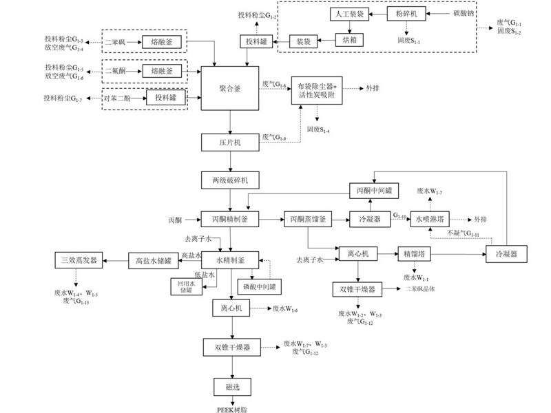 PEEK工业化生产通常采用亲核取代逐步聚合机理,以4,4'-二氟二苯甲酮、对苯二酚为核心原料,以二苯砜为高温溶剂,在碳酸盐存在下缩聚合成。反应完成后,产物、未反应原料、溶剂二苯砜、副产物氟盐(氟化钠/氟化钾)及无机杂质离子(钠、钾、氯、硫酸根等)混合形成固体混合物,必须经过精制提纯后处理,才能去除杂质、降低无机离子含量、提升树脂纯度,满足电子电气、医疗、半导体、航空航天等高要求领域的使用要求。