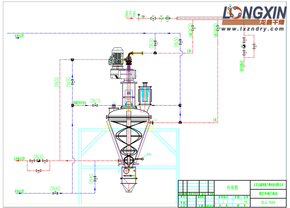 - 物料在罐体内边加热边搅拌,经加热蒸发出的湿分由真空泵抽出,蕞终干燥的物料从锥体底部出口排出。搅拌器由搅拌主轴和与筒体内壁表面吻合的螺带及螺旋叶片组成,旋转时物料由下向上沿筒体内壁盘旋提升,同时产生不规则的对流、剪切、掺混、扩散,形成三维运动。
