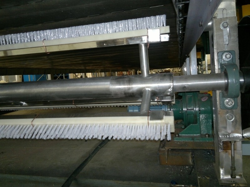 (3) 新型链板式网带干燥机设置网带清扫和清洗结构,提高了带机对粘性强物料的适应性,使再次进入布料的传送网带干净、清洁无杂质,保证干燥后产品的质量。