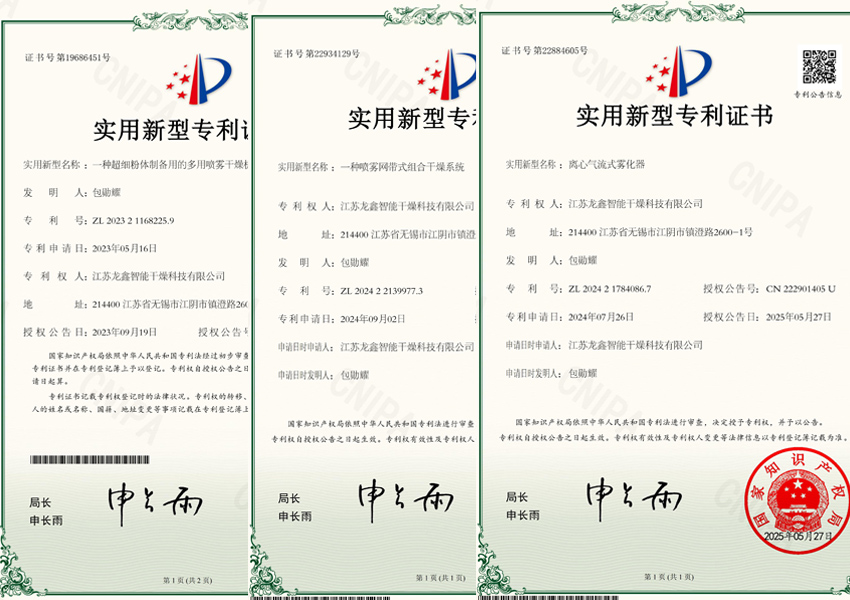 喷雾干燥机”(专 利号:ZL 2023 2 1168225.9、ZL 2024 2 1784086.7),通过材料科学、流体力学与智能控制的多学科融合,实现了从实验室研发到工业化生产的无缝衔接。